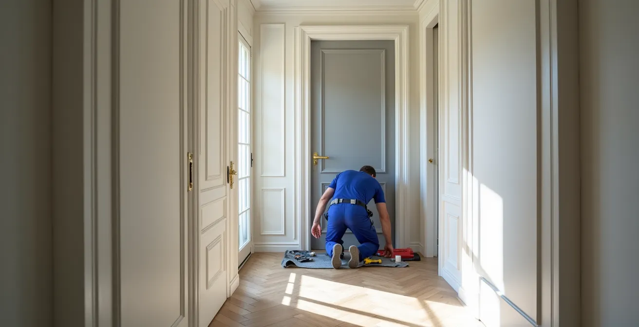 L’installation d’un bloc-porte blindé est une opération chirurgicale qui conditionne 100% de sa performance. Contrairement à une porte classique, il ne s’agit pas de « visser un cadre », mais de réaliser un ancrage structurel capable de reprendre les efforts d’une attaque violente. La première étape, souvent la plus délicate, est la dépose de l’ancien bâti (le dormant). Elle doit être réalisée en préservant l’intégrité de la maçonnerie environnante (mur en béton, brique, parpaing), qui sera la fondation de votre nouvelle sécurité.